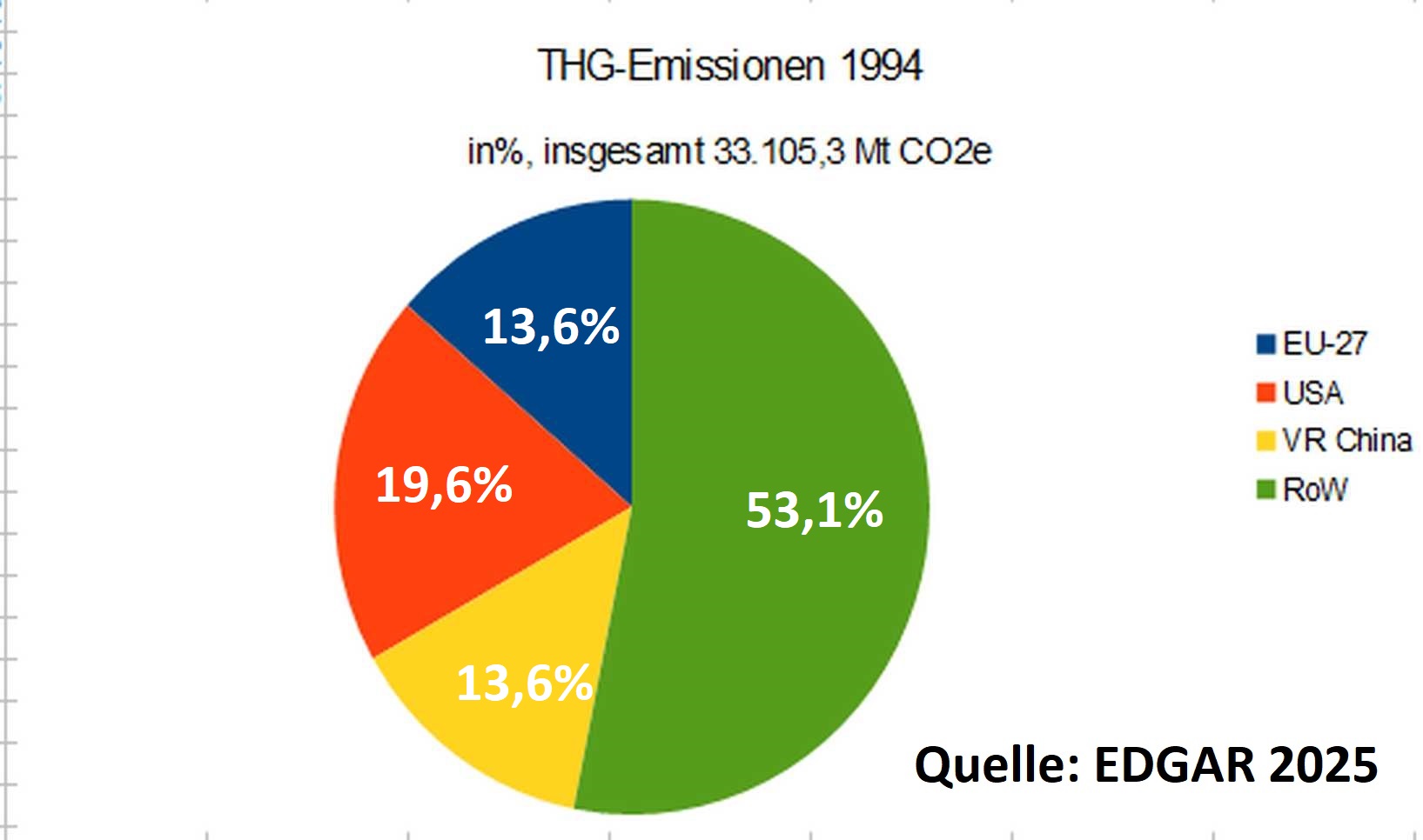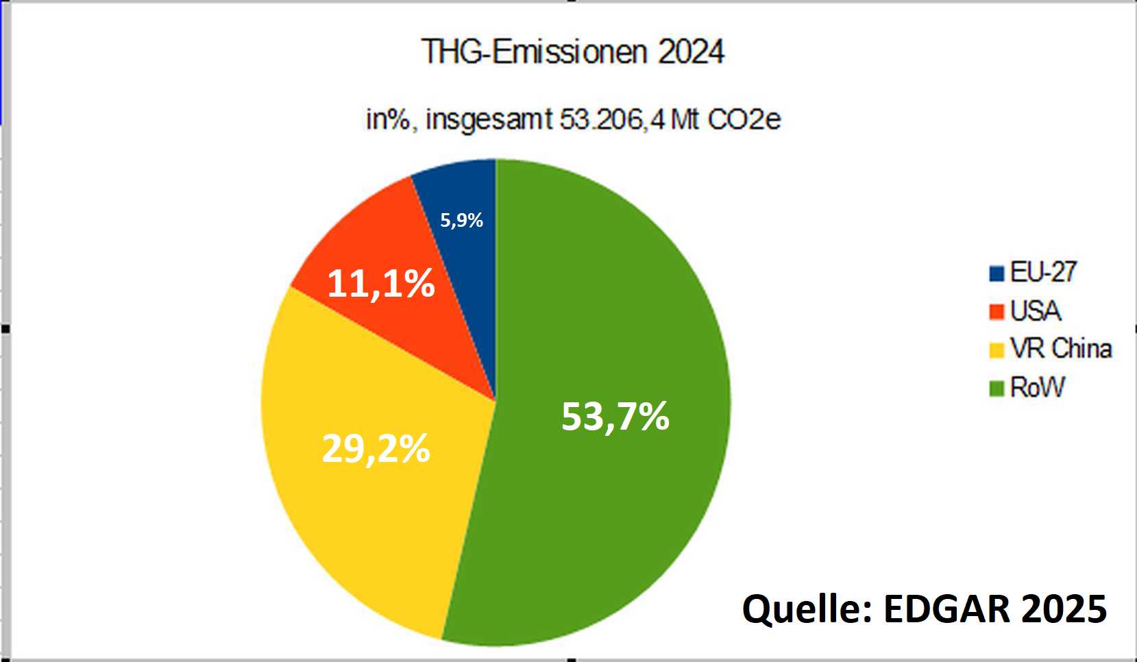 Vorbemerkung: Zunächst soll eingeräumt werden, dass hier nicht alles so passgenau, korrekt und originell vonstatten gegangen ist wie wünschenswert. Das beginnt schon bei den – selbst gemachten – Grafiken zu den Treibhausgasen, die u.a. den Makel haben, dass die 2025er-Zahlen noch nicht da sind, weswegen auf die 2024er-Zahlen ausgewichen werden musste. Weiters fehlt wg. Faulheit ein “kleines Tortenstück” für Japan & Co., das man “restliche OECD” oder irgendwie anders nennen könnte, das 2024 aber wohl kleiner war als das “Tortenstück der EU-27″.