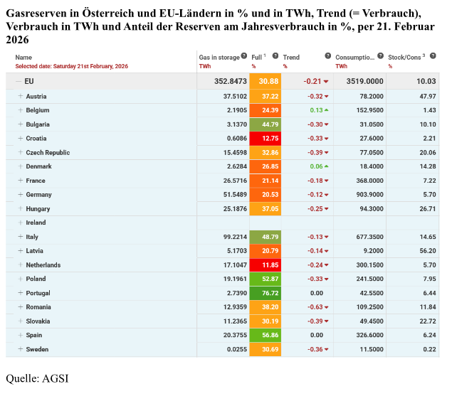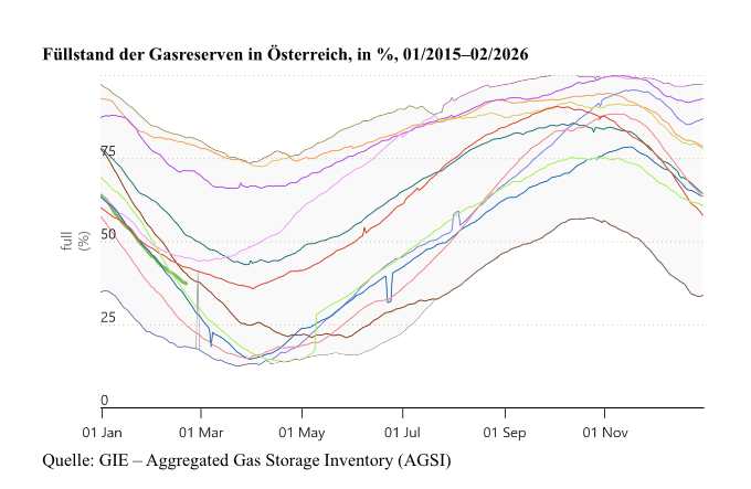 Auf den ersten Blick scheint die Versorgungslage mit Gas in Österreich im gesicherten Bereich zu sein. Denn mit weiterhin mehr als 35% ist der Speicherstand der österreichischen Gasreserven deutlich über dem EU-Schnitt von knapp 31%. Bedenklich ist die Lage jedoch in vielen anderen EU-Staaten, so auch in Deutschland, das in der letzten Februarwoche unter die 20%-Marke fallen wird, während die Niederlande bereits der 10%-Marke bedenklich nahe kommen.