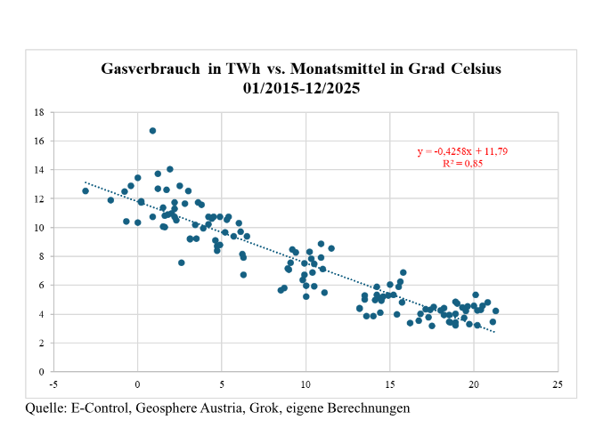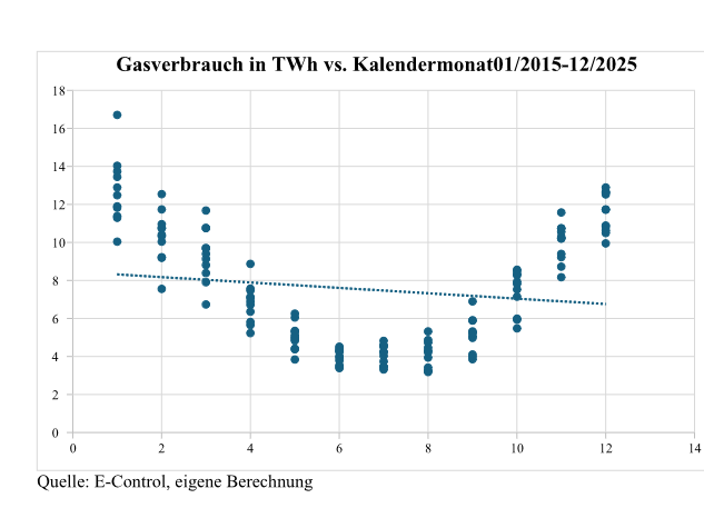 Der Zusammenhang ist, wie zu erwarten ist, negativ. Je höher die Temperaturen, desto geringer ist der Gasverbrauch, je niedriger die Temperatur ist, desto höher ist die Gasnachfrage. Weitere Nachfragefaktoren sind die – weitgehend temperaturunabhängige – industrielle Nachfrage sowie die für Verstromungszwecke relevante Gasnachfrage. Diese Charts finden sich im Anhang.)