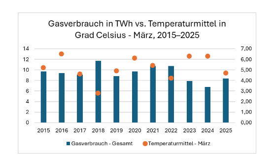 Der Durchschnittsverbrauch im März lag seit 2015 bei 9,4 TWh, mit einer Standardabweichung von 1,3 TWh. 2018 wurden 11,7 TWh Gas verbraucht, 2024 waren es um 5 TWh und damit um mehr als 40% weniger, bei einer Durchschnittstemperatur von 2,8 Grad (2018) bzw. 6,3 Grad (2024).