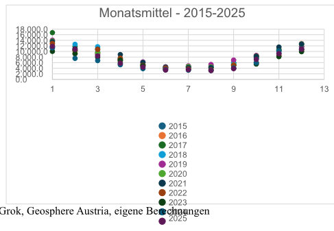 Und im Jahresverlauf je Kalendermonat für die Jahre 2015–2025.
