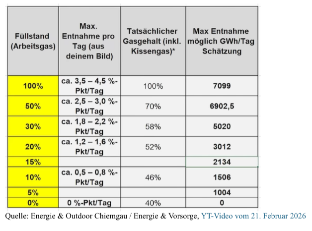 Erschwerend könnte allerdings hinzukommen, dass laut fortlaufenden Berechnungen (per 20. Februar) von „Energie & Outdoor Chiemgau / Energie & Vorsorge“ Deutschland in den 30 Tagen davor im Schnitt 0,8 TWh Gas aus den Niederlanden erhielt. Das entspricht 25% der deutschen Bruttoimporte. Angesichts des Füllstands in den Niederlanden von rund 12% ist es nicht unwahrscheinlich, dass diese wichtige Quelle für Deutschland demnächst (teilweise) versiegt.